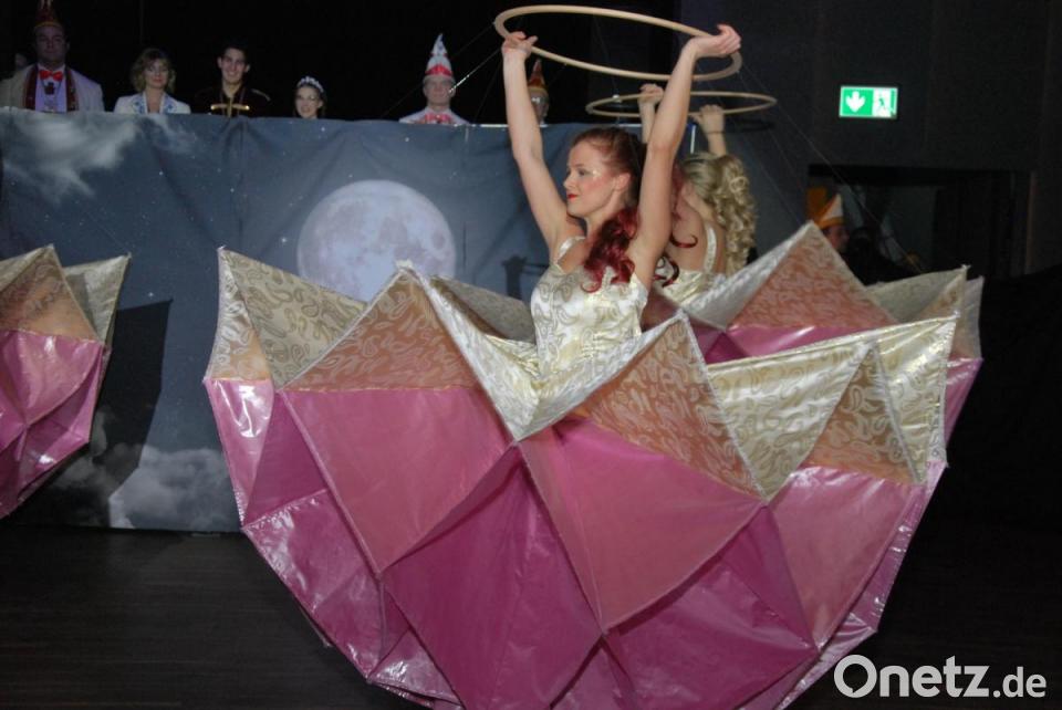 Auch die 13 Gardemädchen der Narrhalla Haselmühl-Amberg-Kümmersbruck, prächtig gestylt mit ihren Federhüten, boten eine artistische Show. Ihre Präsidentin Denise Forster führte auch durch das Programm an diesem Abend. Und die Narrhalla Rieden ließ schließlich die Gäste teilhaben an der „Mission Apollo 6“ und entführte sie auf eine „Reise in die Galaxie“.