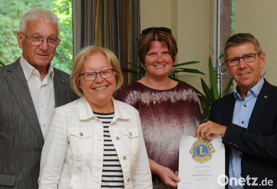 Lions-Präsident Robert Jung und Hans Roggenhofer, der Vorsitzende des Lions-Hilfswerks, überreichten den Spendenscheck an zwei Vertreterinnen des SkF, Vorsitzende Marianne Gutwein und Geschäftsführerin Andrea Graf. Die beiden Frauen nutzen die Gelegenheit, den Lions-Repräsentanten die Arbeit des SkF vorzustellen. In Not geratene Menschen, vorrangig Frauen, Familien und Kinder werden unabhängig von Konfession, Weltanschauung und gesellschaftlicher Stellung von gut 130 ehrenamtlichen Mitarbeiterinnen, außerdem 23 hauptamtlichen pädagogischen Fachkräften betreut. Diese wenden dafür geschätzte 20 000 Arbeitsstunden pro Jahr auf.
