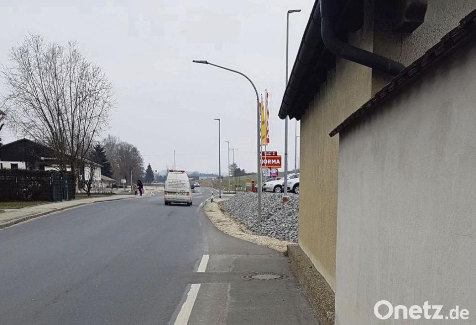 "Fußgänger müssen neben der gefährlichen Hauptstraße entlang gehen und dann hört der Weg plötzlich vor dem Parkplatz auf", bemängelt die Leserin. "Vor allem für Kinder, ältere Personen ist dies sehr gefährlich." Tatsächlich bleiben den Fußgängern in Richtung Supermarkt nur zwei Möglichkeiten: Entweder sie gehen bis zum Ende des Schutzstreifens und legen den Rest des Wegs bis zum Markt-Gelände auf der Straße zurück. Oder aber sie wechseln am Ende des Schutzstreifens auf den gegenüber liegenden Gehsteig, gehen dort die paar Meter bis zur Norma und wechseln dann wieder hinüber. "Ist es zumutbar, mit Einkaufskorb, Kinderwagen oder Rollator die gefährliche Straße zu überqueren - wobei der Bürgersteig nicht mal abgesenkt ist, oder einen zehn Mal so langen Weg über die Ampel in Kauf zu nehmen?"