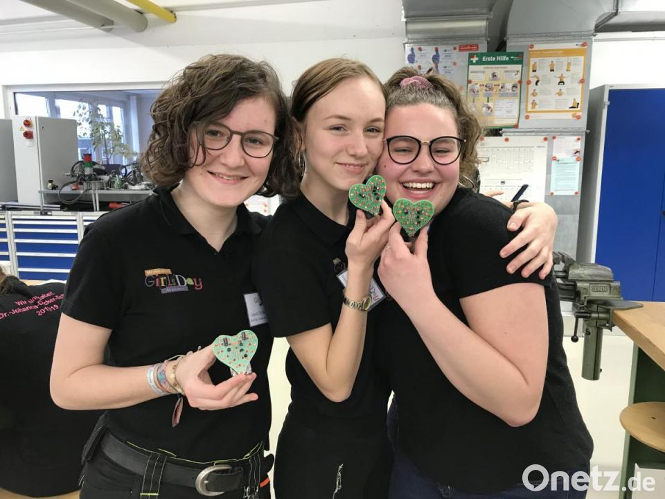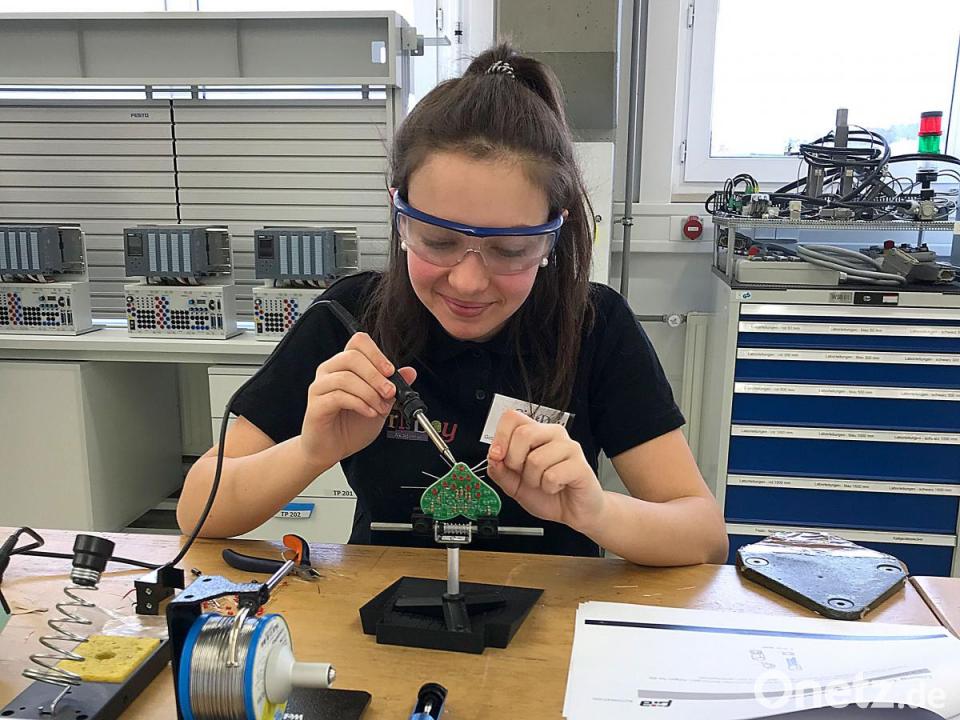 Die Begeisterung der beiden Azubis für ihren Beruf sprang auf die Decker-Schülerinnen über. Die jungen Damen konnten es kaum erwarten, in der Ausbildungswerkstatt selbst Hand anzulegen. Unter Anleitung von Ausbildungsleiter Stephan Schmalz und einer Gruppe von Azubis durften die Mädchen ein mit LEDs bestücktes Herz löten. Dabei bewiesen die Schülerinnen, die zum ersten Mal mit Lötkolben arbeiteten, großes Geschick. Am Ende der praktischen Einheit schauten alle stolz auf ihre blinkenden LED-Herzen, die sie mit nach Hause nehmen durften.