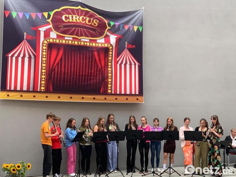 Eine Trompetengruppe, geleitet von Instrumentallehrer Robert Vogel, gab eine kleine Zirkusmusik zum Besten. In den fünf kleinen Stücken konnten die Schülerinnen und Schüler ihr Können solistisch unter Beweis stellen. Das Saxophonensemble (Leitung Elke Beer) trug mit launigen Stücken ihren Teil zum Gelingen des Abends bei, das große Querflötenorchester (Iwona Simonides) unterhielt das Publikum mit dem CanCan von J. Offenbach. Gekonnt trug Magdalena Matz das Stück „Circus Theme“ von Fishel Pustilnik solistisch am Cello vor.