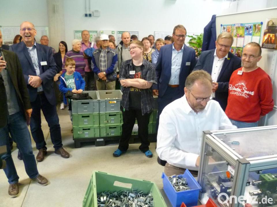 Bezirksrat Martin Preuß und Joachim Rauhut, Leiter des Fachzentrums Teile bei der Siemens AG in Amberg, für das die Mitarbeiter der Jura-Werkstätten kleine Komponenten herstellen, traten zur Freude der Beschäftigten und der zahlreichen Besucher zu einer eigentlich aussichtslosen Wette an. Es galt, gegen zwei Beschäftigte an zwei verschiedenen Arbeitsplätzen in Sachen handwerklicher Geschicklichkeit bei der Montage ehrenvoll zu bestehen.
