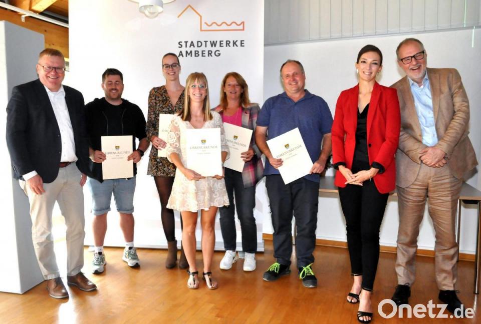 Bei den Stadtwerken Amberg gab es Mitarbeiterehrungen. Ihr 20-jähriges Dienstjubiläum hatten dieses Jahr unter anderem: Susanna Seider, Daniel Merkl, Michael Meier. Susanna Seider unterstützt seit dem 1. April 2003 bis heute das Kundencenter-Team der Stadtwerke Amberg Versorgungs GmbH. Daniel Merk startete seine Karriere bei den Stadtwerken Amberg als Auszubildender am 1. September 2003. Nach Beendigung seiner Ausbildung fing er am 12. Juni 2006 in der Stadtwerke Amberg Holding GmbH in der Betriebswirtschaft an. Es folgte eine Weiterbildung zum geprüften Bilanzbuchhalter, die er am 15. Dezember 2015 abschloss. Inzwischen ist Daniel Merkl die Karriereleiter weiter nach oben gegangen und am 1. März 2021 zum stellvertretenden Abteilungsleiter Betriebswirtschaft ernannt worden. Michael Meier begann seine Ausbildung zum Fachangestellten für Bäderbetriebe in der Stadtwerke Amberg Bäder und Park GmbH am 1. September 2003. Nach bestandener Prüfung am 29. Juni 2006, ging es sofort weiter in die Einstellung als Fachangestellter für Bäderbetriebe, wo er auch heute noch gerne tätig ist. Viele kennen ihn gerade auch von seinem Arbeitsplatz, dem Hockermühlbad Amberg. Ihre zehnjährige Betriebszugehörigkeit feierten heuer unter anderem: Alicia Schreier; Leon Storch, Simone Wirth, Alexander Rösch und Hannes Scheinost.