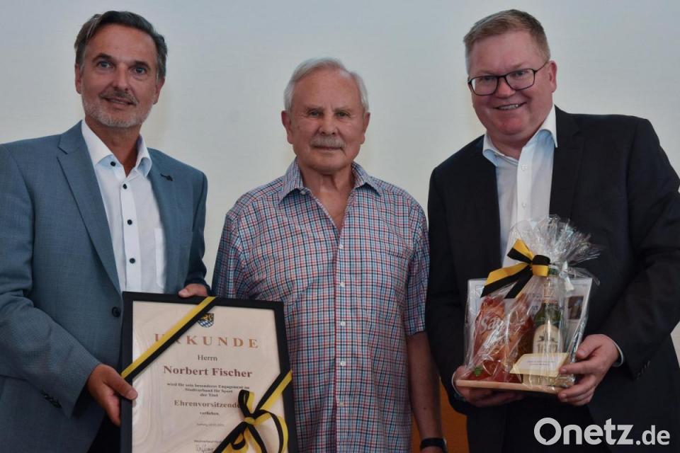 Doch damit nicht genug. Wolfgang Meier listete weitere Aktionen und Veranstaltungen auf, die eng mit dem Namen Norbert Fischer verbunden sind: Generationen-Sportfest, 24-Stunden-Schwimmen, Amberger Triathlon, Vier-Tore-Lauf und Freundschaftsmarathon Amberg-Weiden. Dass Fischer dem Amberger Sport auch mit 77 Jahren eng verbunden bleibt, sei klar. Einen "Rücktritt vom Rücktritt" schloss der Geehrte im Gespräch mit Ambergs Oberbürgermeister Michael Cerny aber aus: "Ich bin mir sicher, dass der Stadtverband mit dem aktuellen Team um Wolfgang Meier, Bernhard und Helga Powalla so gut weiterläuft." Und: "Einer allein schafft gar nichts. Man braucht schon ein gutes Team. Das hatte ich immer."