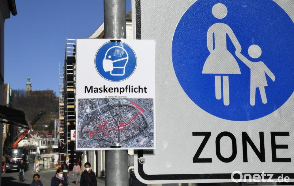 Der Marktplatz in Amberg gehört zu den Zonen, in denen zur Eindämmung des Coronavirus das Tragen eines Mund-Nasen-Schutzes aktuell vorgeschrieben ist. Darauf wird auch auf Schildern hingewiesen.