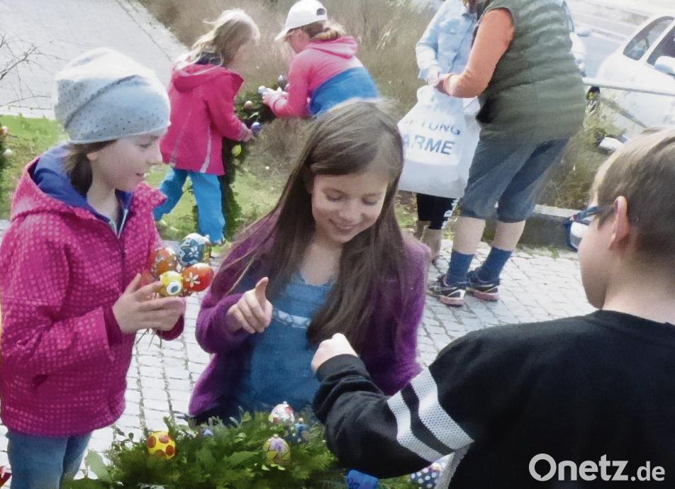 In Neukirchen schmücken Kinder den Zugang zur katholischen Kirche unter Regie des Gartenbauvereins österlich.