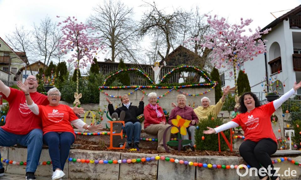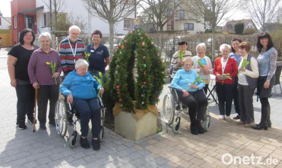 Heimleiterin Annett Schmerbauch (rechts) freut sich mit den Bewohnern des Evergreen-Hauses in Schnaittenbach über den schön geschmückten Osterbrunnen am Hauseingang.