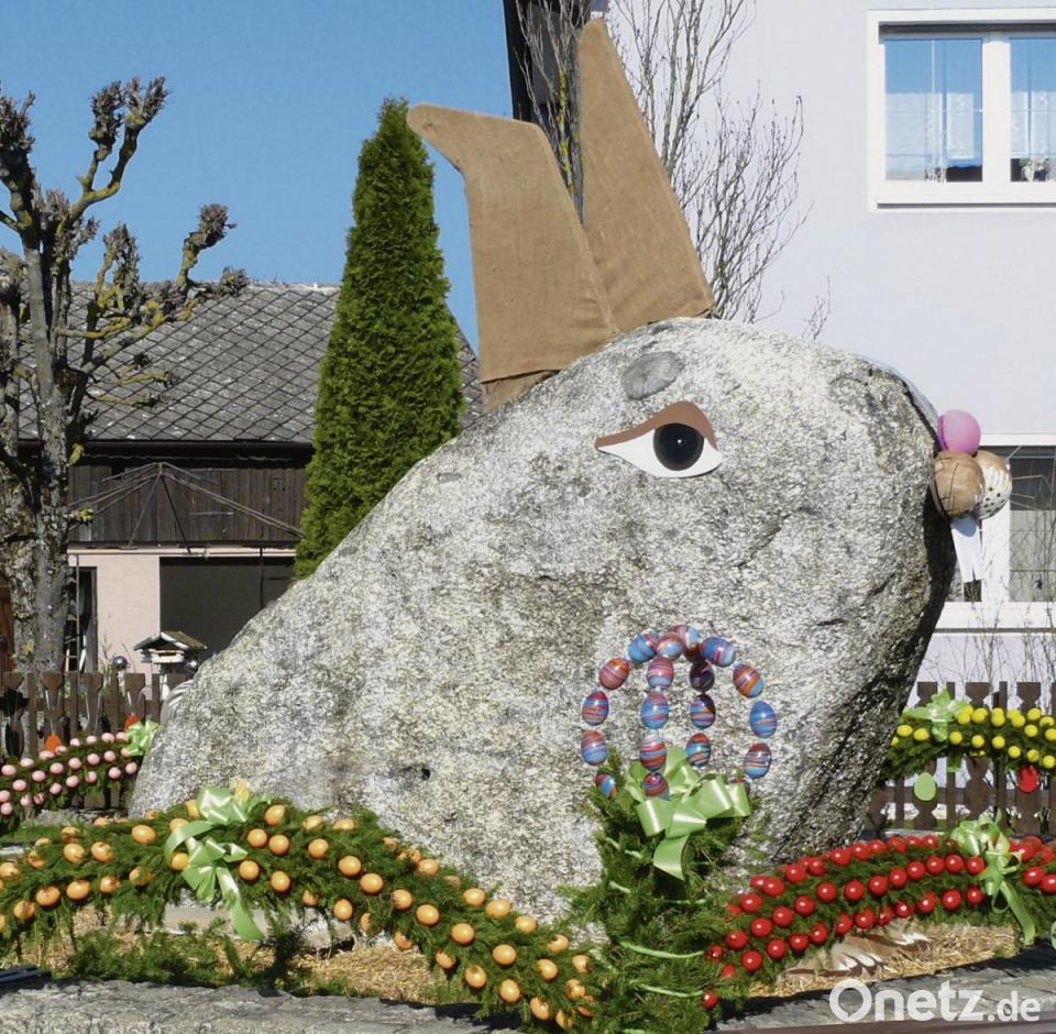 Hier kann man schon vor Sonntag dem Osterhasen begegnen: Der Obst- und Gartenbauverein Raigering-Aschach belässt es nicht allein beim Brunnenschmuck.