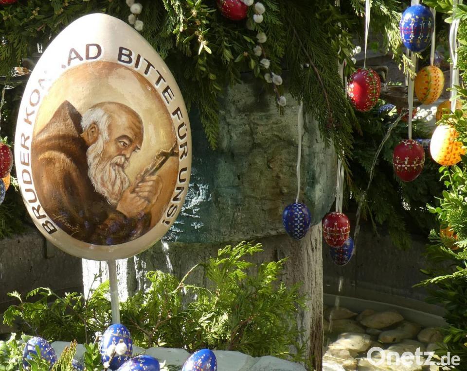 Am Brunnen der Bruder-Konrad-Kirche in Ebermannsdorf hat Künstler Hans-Georg Hierl den Patron auf einem Riesen-Ei verewigt.
