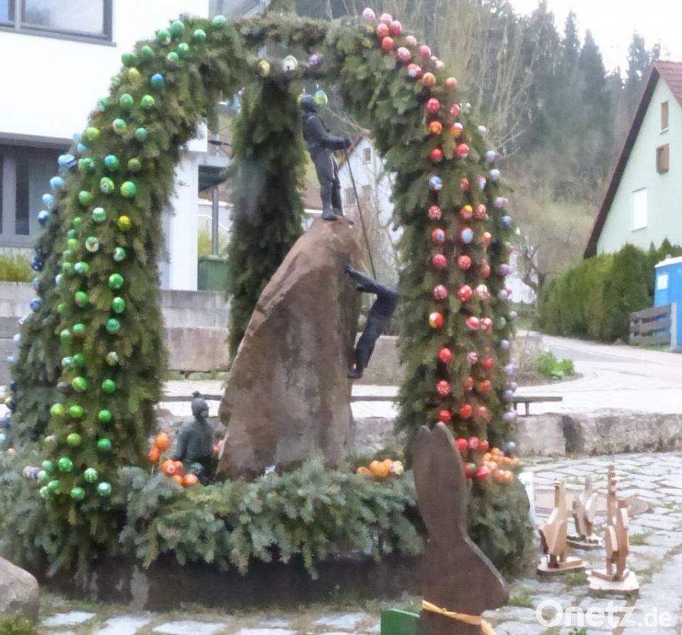 Ein Team aus rund 20 fleißige Frauen und Männer hat an die dreitausend Eier in Girlanden geflochten und dann kunstvoll am Kastler Marktplatzbrunnen- dem Osterbrunnen verbaut.