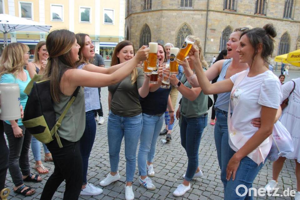 Eine Schar feiernder Damen (Stichwort Junggesellinnen-Abschied) durfte gleich mal den frisch gezapften Gerstensaft testen. Der "Dreiklang" sei mit den Bierwochen erfunden, man habe dadurch neben dem Bergfest und dem Bierfest die Marke "Bierstadt Amberg" weiterentwickelt, sagte OB Cerny nach dem erfolgreichen Anstich. "Aus der Not heraus", erinnerte Thomas Eichenseher vom Amberger Stadtmarketing-Verein, wurden 2020 als Ersatz für das ausgefallene Bergfest die Bierwochen geboren. Jetzt habe man in der Umsetzung nachjustiert und ein Modell geschaffen, dass auch in den kommenden Jahren Bestand haben könne.
