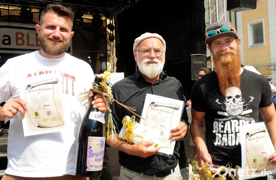 (ass) Eben noch war er "nur" pensionierter Direktor des Erasmus-Gymnasiums, jetzt besitzt Peter Seidl (Mitte) auch noch den schönsten Amateurbart der Stadt. Knapp setzte sich Seidl am Sonntag auf dem Altstadtfest bei der Jury durch, die im Auftrag des Ostbayerischen Bartclubs nach dem attraktivsten Gesichtsschmuck der Region suchte. Rang zwei belegte am Ende knapp dahinter Philipp Hofmann (links), Dritter wurde Peter Hampl (rechts). Mit Platz fünf musste sich übrigens Michael Honig, alias der BBou, zufriedengeben. Seine Bartperformance konnte die Jury am Ende nicht vollständig überzeugen. Insgesamt nahmen 16 Kandidaten an der Wahl teil.