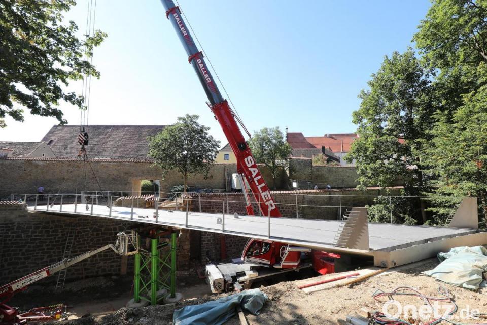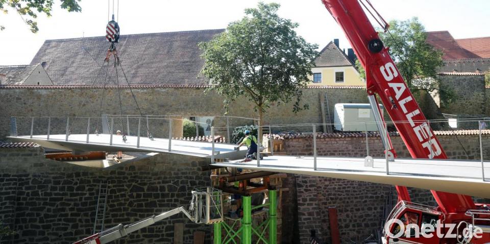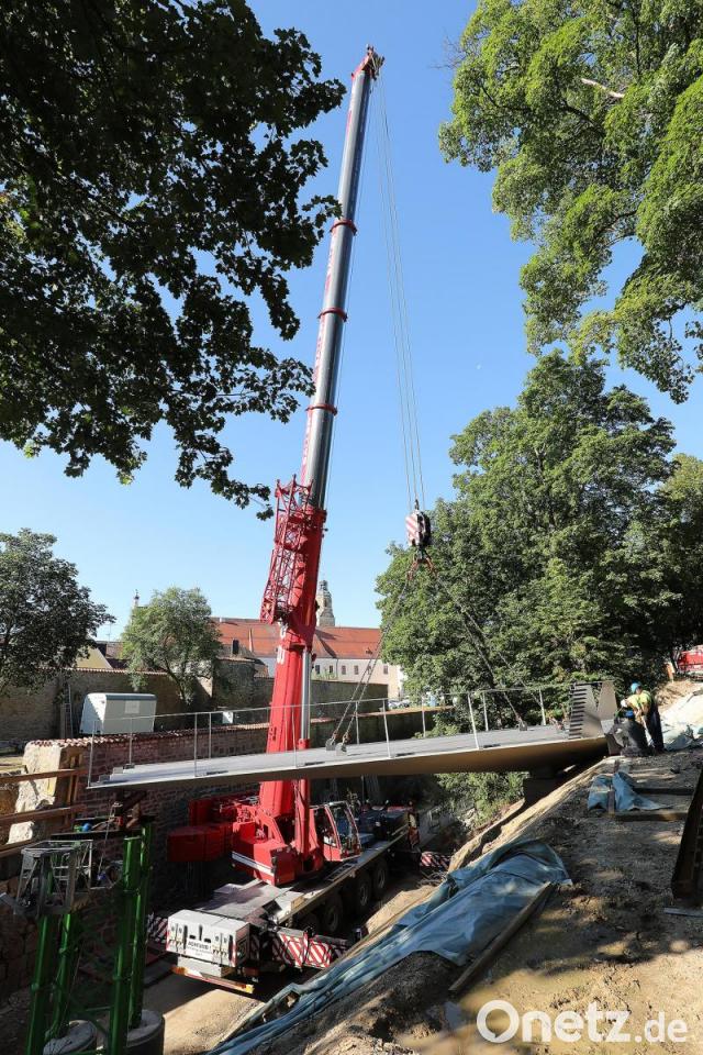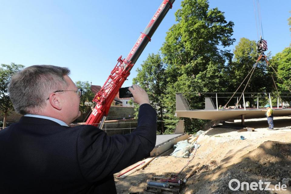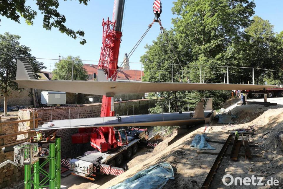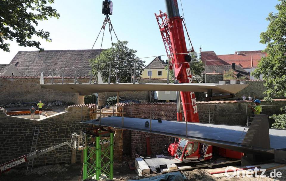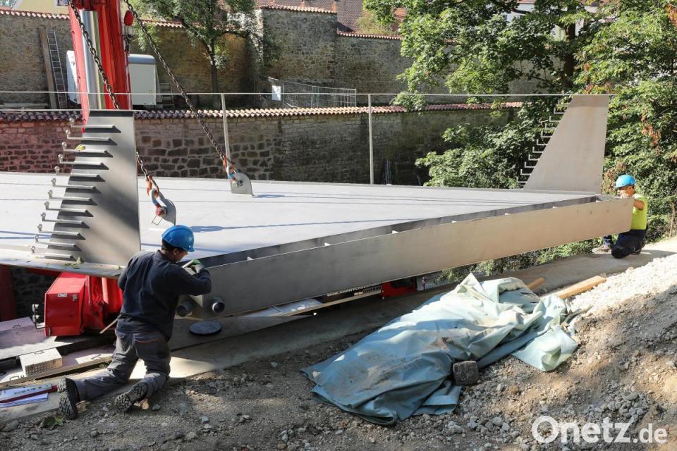 Seit drei Jahren warten die Amberger auf ihren neuen Pioniersteg. Jetzt schwebte er elegant über dem Stadtgraben ein.