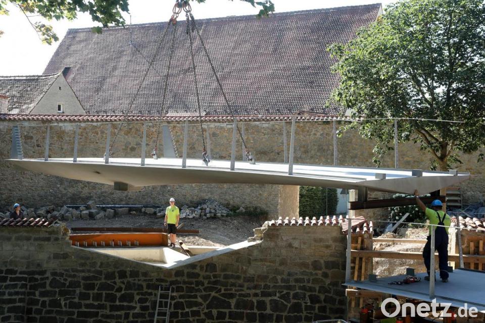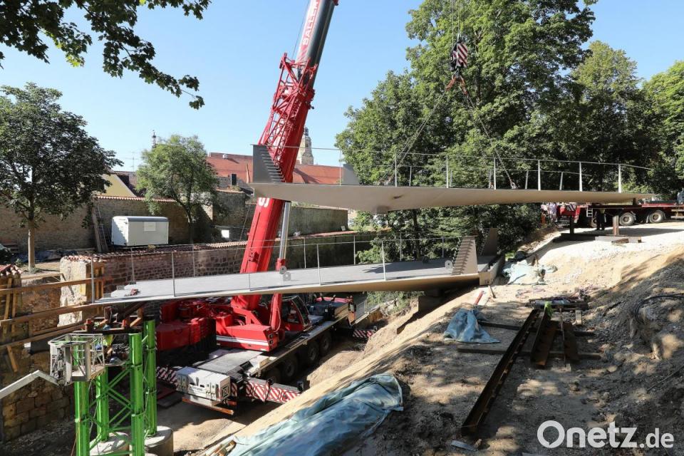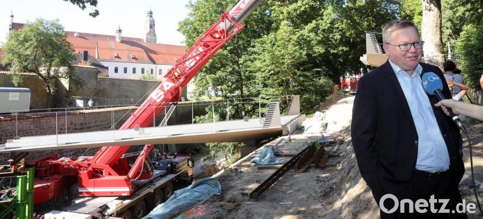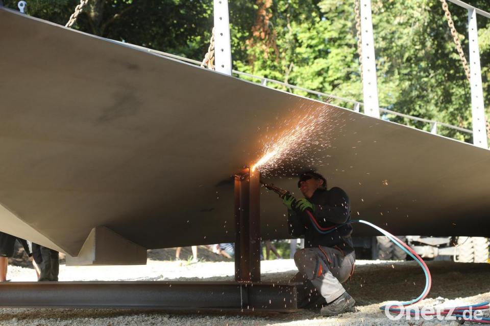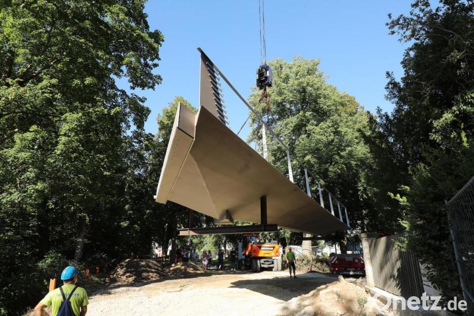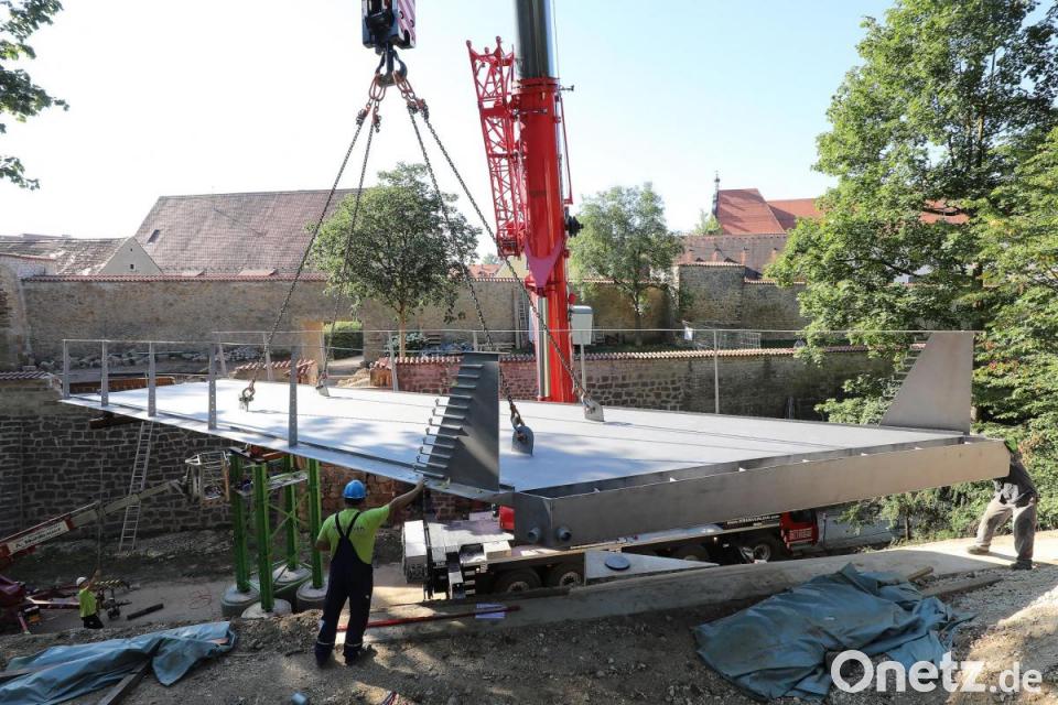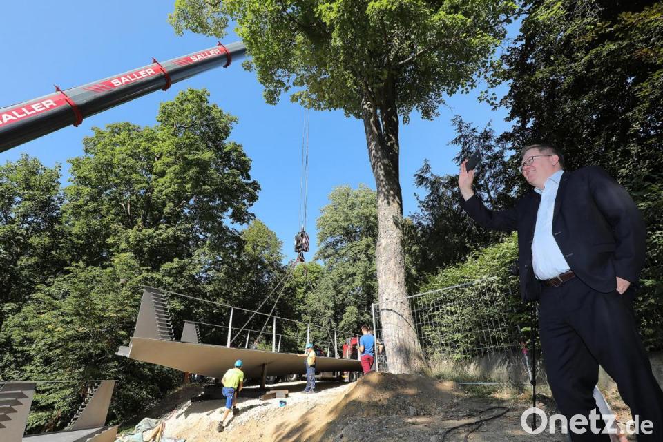 Seit drei Jahren warten die Amberger auf ihren neuen Pioniersteg. Jetzt schwebte er elegant über dem Stadtgraben ein.