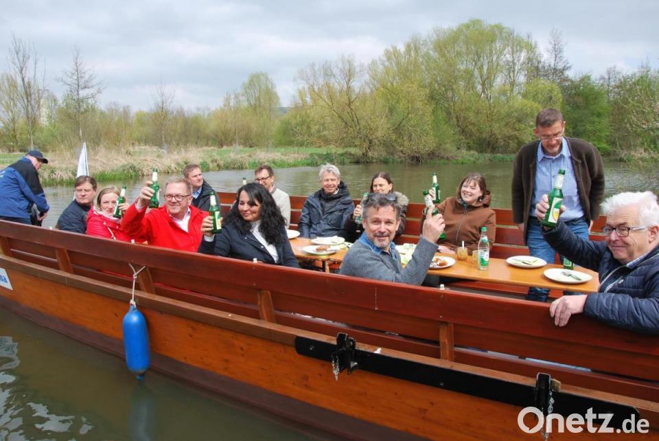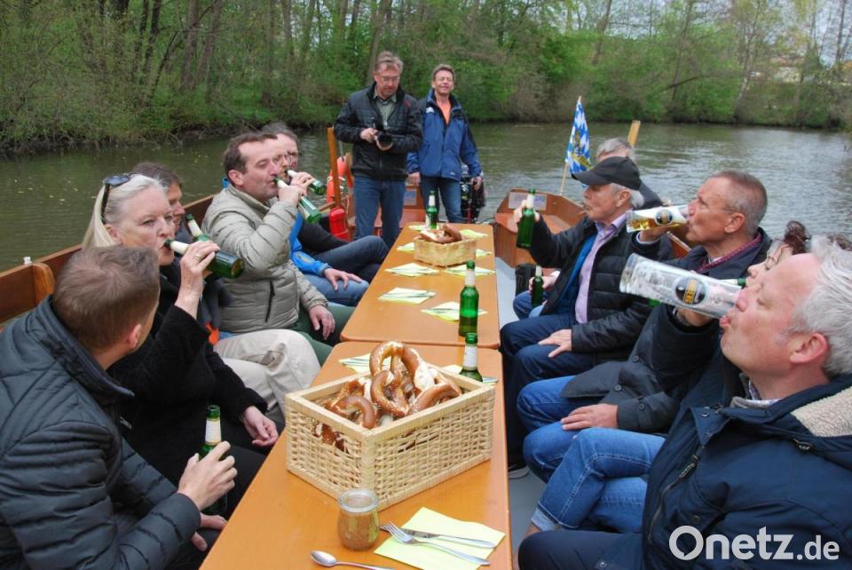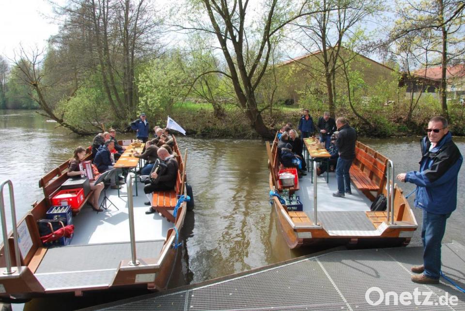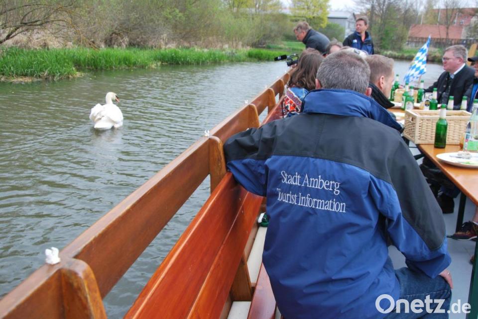 Schon zu Tradition beim Bieranstich gehört die Plättenfahrt. Ein Vierteljahrhundert bereits, seit 1997, dem Jahr nach der Landesgartenschau in Amberg, gibt es diese touristische Attraktion auf der Vils. Auf zwei dieser den mittelalterlichen Transportkähnen nachempfundenen Booten ging es für alle Ehrengäste unter der Führung des Oberbürgermeisters bis zur Anlegestelle beim Drahthammerschlössl und wieder zurück. Zur Stärkung gab es was wohl? Natürlich Weißwürste und Amberger Bier.
