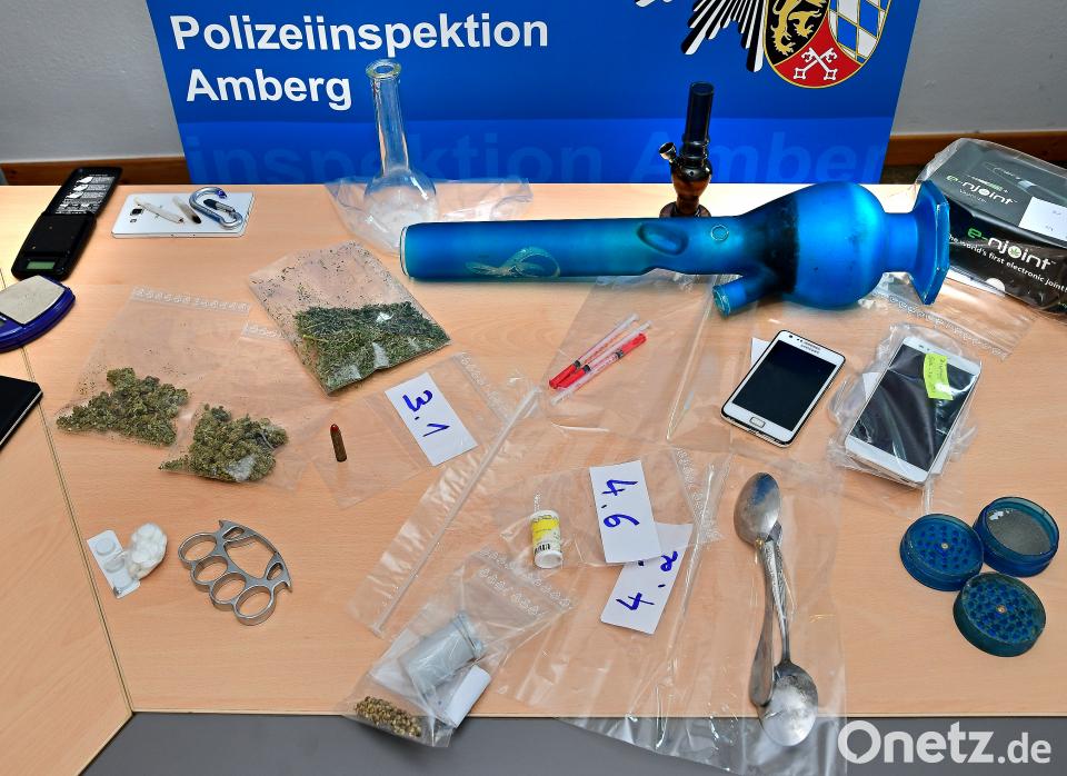 Ein Teil der Ausbeute der PI bei der Durchsuchungsaktion am Mittwoch. Beim Fixerbesteck (4.2) und der blauen Wasserpfeife (oben) wurden noch Anhaftungen von Heroin bzw. Marihuana festgestellt. Die scharfe Patrone (3.1) bringt ihrem Besitzer eine Anzeige wegen eines Verstoßes gegen das Waffengesetz ein. Bild: Petra Hartl