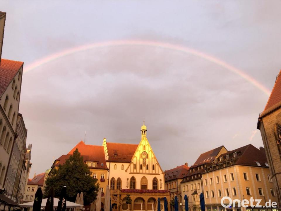 Es spannt sich ein langer Regenbogen über das historische Rathaus von Amberg. Die goldgelbe Herbstsonne schickt ihre letzten Strahlen auf die Erde. Diesen Moment hat AZ-Leserin Margot Schödel mit der Kamera für uns festgehalten.