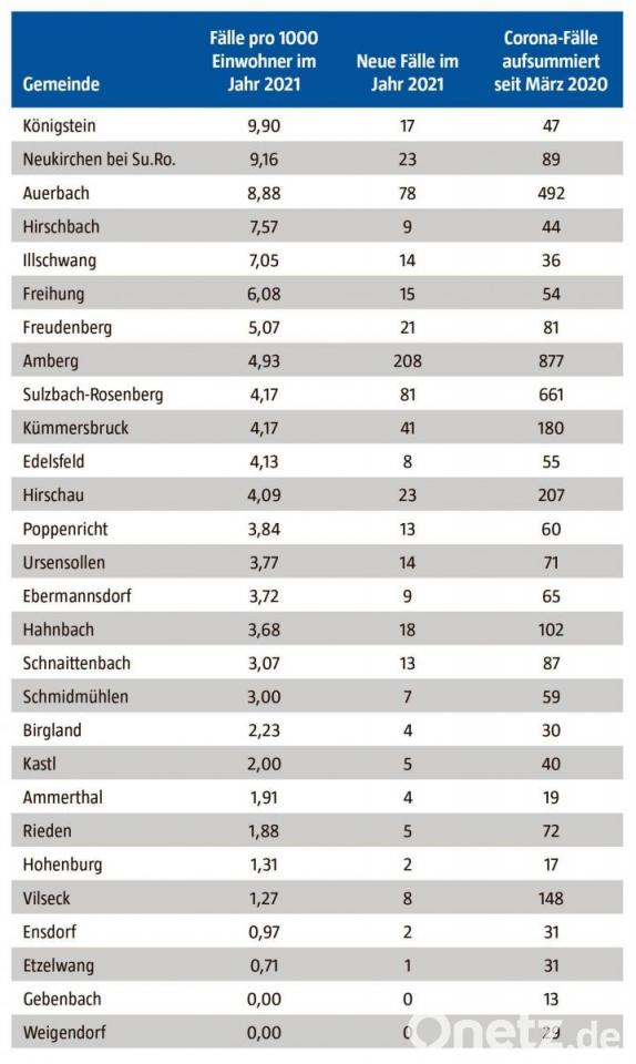 Nach absoluten Zahlen weisen natürlich die großen Kommunen in der Region im Jahr 2021 die meisten bestätigten Coronafälle auf: Amberg 208, Sulzbach-Rosenberg 81, Auerbach 78. Doch wenn man die Infektionen auf die Einwohnerzahl umrechnet, liegen plötzlich Königstein und Neukirchen vorne; gefolgt von Auerbach, Hirschbach und Illschwang. Alle diese Kommunen liegen im nordwestlichen bzw. westlichen Teil des Landkreises.