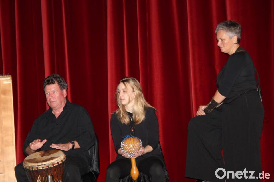 Nur spärlich erhellt war der Saal, als die Gäste eintrudelten. Deutlich zu sehen waren jedoch das Equipment und die Instrumente: Gongs, Trommeln, Tamburins und Percussions. Für die Musik waren Helmut Kaiser und Patti Sonnleitner aus Regensburg zuständig. SkF-Vorsitzende Marianne Gutwein erklärte zunächst den Hintergrund der Aktion: Der Erlös fließe in den Bau neuer Schutzwohnungen und eines Frauenhauses. Nach der Begrüßung herrschte Kino-Finsternis: Ur-Klänge ertönten und stimmten auf den Abend ein, der die Gäste mit Mythen, Märchen und Musik mitnahm auf eine Reise durch die Schöpfungsgeschichte und die Lichtwerdung. Nachdenklich machend und melancholisch, witzig und heiter, romantisch und verträumt waren die Erzählungen, denen Kreiner mit Gestik, Mimik und ihrer Stimme Leben einhauchte und ihre Zuhörer in eine andere Welt versetzte.