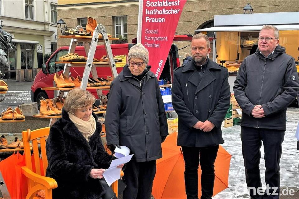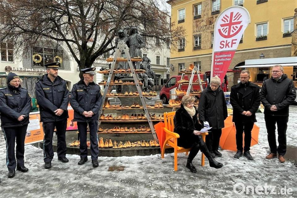 Die Geschichte von Christin, die die Mitarbeiterin des SkF-Notrufs Julia Möbus der ARD-Serie „Sie mussten sterben“ entnommen hatte, konnte nicht nur auf einem schlichten Blatt Papier nachgelesen werden, das an den Regalen mit orangefarbenen Schuhen befestigt war. Während diese erneut die von ihren Partnern oder Expartnern getöteten Frauen symbolisierten, hatte es Oberbürgermeister Michael Cerny übernommen, auf das kurze Leben Christins zurückzublicken.