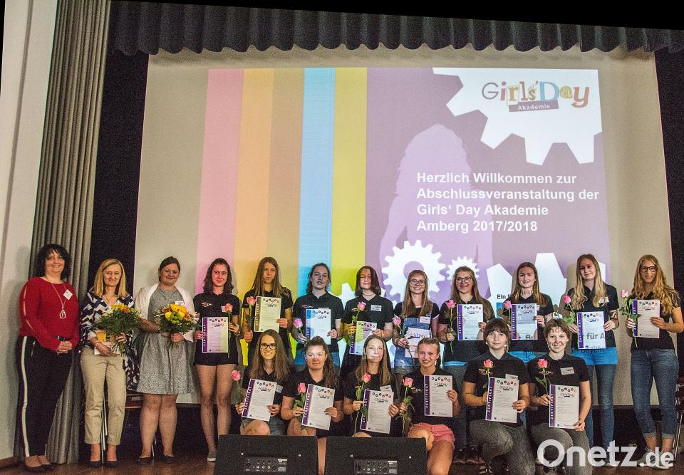 erste Reihe von rechts: Realschulkonrektor Richard Reber, Studiendirektorin Monika Wagner (Stellvertretende Schulleiterin), 2. Bürgermeister Martin Preuß, Hermann Brandl ( Geschäftsführer/Opf. bayme vbm), Kerstin Eder (Teamleitung Berufsberatung, Agentur für Arbeit Amberg), Tina Voggenreiter (Girls' Day Akademie). zweite Reihe: Verena Schlosser (Auszubildende, pia Automation), Herbert Koller (Fachgruppenleiter Elektro, Siemens)