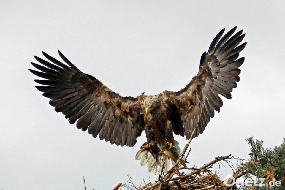 Eines der Elterntiere flog auf den Horst zu, hatte einen vorher erbeuteten Fisch in der linken Kralle und wollte offenbar den Nachwuchs füttern. Doch der Jungadler, unterdessen flügge, hockte hoch droben auf einem benachbarten Baum. Also drehte der erwachsene Beutegreifer ab, änderte seine Flugrichtung und brachte den Fisch zum Jungtier, das durch laute Schreie auf sich und seinen großen Appetit aufmerksam gemacht hatte.