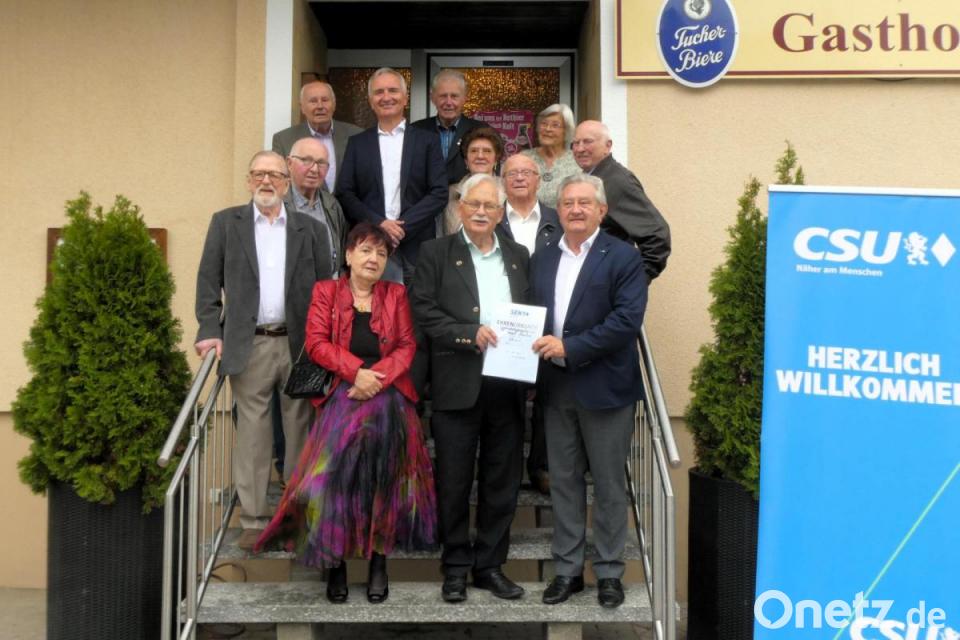 Die Ehrung der Jubilare nahmen Kreisvorsitzender Helmut Fischer, Landesvorsitzender Franz Meyer, Bezirksvorsitzende Evi Bauer-König und CSU-Kreisvorsitzender Harald Schwartz vor. Sie überreichten nach der persönlichen Würdigung neben der Ehrenurkunde einen Gutschein für eine Landtagsfahrt für zwei Personen, gestiftet von Schwartz, sowie eine große Tüte Kartoffeln vom Trummer-Hof in Hahnbach.