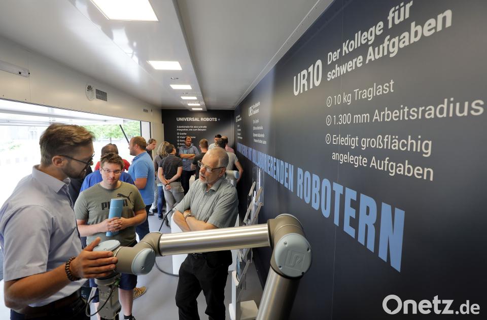 (pwpt) Der Show-Truck von Universal Robots hat am Montag auf dem Campus der Ostbayerischen Technischen Hochschule (OTH) Station gemacht. Er ist in ganz Deutschland und der Schweiz unterwegs. Mit im Gepäck hatte das Team Roboter-Arme. Im Grunde genommen handelt es sich dabei tatsächlich nur um Arme. Bekommt der Roboter aber das richtige Werkzeug in die Hand, zeigt er, was er kann. Das Modell UR5 kann Arbeiten, die manuell bis zu zwei Tagen dauern würden, innerhalb von vier Stunden erledigen.