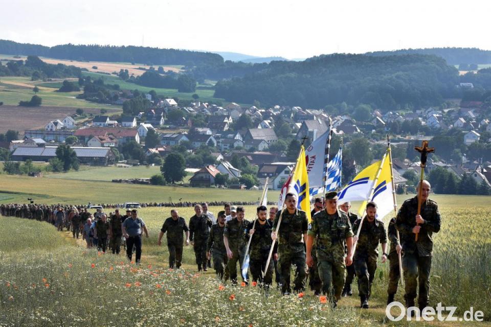 Rund 1000 Soldaten pilgern jedes Jahr im Juli auf den Mariahilfberg in Amberg. Die größte Soldaten-Fußwallfahrt des Landes ist ein traditioneller Höhepunkt der Festwoche. So war es auch am Donnerstag. Mit dabei waren neben Bundeswehrsoldaten auch Zivilangestellte, Familien und Mitglieder der der US-Armee. Nach dem Abmarsch um 8 Uhr von der Schweppermannkaserne war gegen 9.30 Uhr schon der Fuß des Berges erreicht. Strammen Schrittes ging es dann steil hoch zur Bergkirche, in der der Gottesdienst unter der Leitung mehrerer Militärgeistlicher stattfand. Zur Regeneration ließen sich die Wallfahrer im Anschluss Bier und Bratwürste schmecken. Auch das hat Tradition.