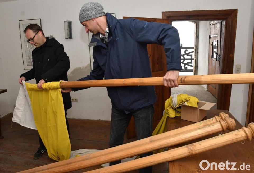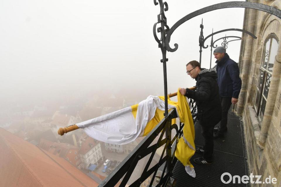 Schon sehr lang nicht mehr benutzt worden sind auch die sogenannten "Zachäusfahnen" – lange Banner, die einst zur Kirchweih am Turm befestigt wurden. Diese Fahnen sind heute allgemein selten geworden. Andernorts sind sie rot-weiß, in St. Martin aber sind sie gelb-weiß. Pfarrer Thomas Helm und Mesner Thomas Pesold nahmen das Patrozinium zum Anlass, um diese Tradition neu zu beleben: Am frühen Morgen stiegen die beiden im Martinsturm hoch bis zum Umlauf unter der Uhr, um dort am Geländer in den vier Himmelsrichtungen die langen Holzstangen mit den "Zachäusfahnen" anzubringen. Nur am Donnerstag hingen sie dort, sollen aber künftig wieder öfter zu sehen sein – zu besonderen Anlässen in der Pfarrei St. Martin.