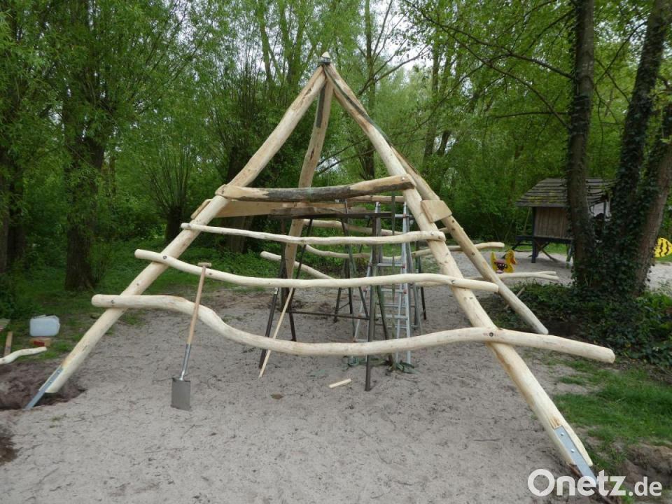 Der freischaffende Künstler und Spielplatzideengeber Eckart Brandau hat das Spielgelände 1996 zur Landesgartenschau gestaltet. Nun beteiligte er sich noch einmal kreativ. Als Ersatz für das alte und vermorschte Baumstammdickicht am Rande des Spielstrandes hat er eine Kletterpyramide aus Robinienholz geliefert. Die Pyramide vereinigt mehrere Spielfunktionen in sich und wertet nach Ansicht der Stadt diesen Bereich künftig auf. Die umfangreichen Arbeiten sollen voraussichtlich Mitte Mai abgeschlossen sein und kosten rund 60.000 Euro.