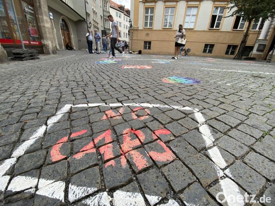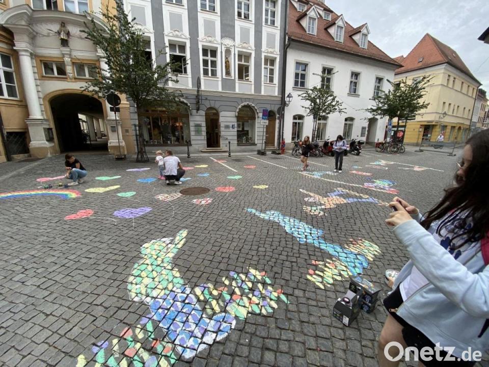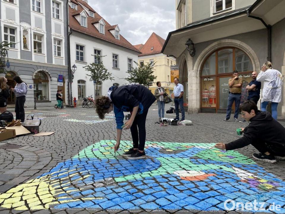 Seit Ostern ist der Hallplatz hinter dem Amberger Rathaus offiziell ein verkehrsberuhigter Bereich. Das heißt: Autos und andere Fahrzeuge dürfen hier höchstens in Schrittgeschwindigkeit fahren. Weil das Viele noch nicht verinnerlicht haben, setzte das Erasmus-Gymnasium zusammen mit der Stabsstelle Mobilität der Stadt nun ein farbenfrohes Zeichen. Schüler aus den Jahrgangsstufen 6 und 7 durften am Dienstagvormittag das Pflaster mit bunten Motiven bemalen. Die Straße war deswegen zwischen 8 und 12 Uhr für den Verkehr gesperrt. Normalerweise treffen an dieser Stelle jeden Tag rund 7200 Fußgänger, 800 Rad- und 2400 Autofahrer aufeinander. Die Heranwachsenden zeigten, wie schön der Platz sein kann, wenn keine Autos den Weg versperren und erinnerten daran, dass der Fußverkehr hier nicht durch den Fahrzeugverkehr gefährdet oder behindert werden dürfen. Auch mit spielenden Kindern ist hier immer zu rechnen.