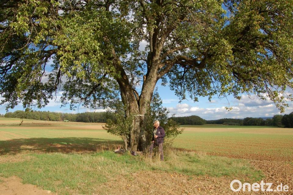 Sein Sohn Norbert erzählt, dass diese großen alten Sußbirn-Bäume so etwas wie ein Wahrzeichen für Steinling sind. "Bei der Flurneuordnung hieß es, das seien ganz besondere Bäume, die sollten unbedingt erhalten bleiben. Die sind quasi geschützt." Der größte noch erhaltene Sußbirn-Baum steht im Tal östlich der Straße. Sein Stamm hat einen Durchmesser von einem Meter, und seine Krone ist etwa 15 Meter breit. An der Stelle, wo sich der Stamm verzweigt, wird er durch ein breites Metallband zusammengehalten.