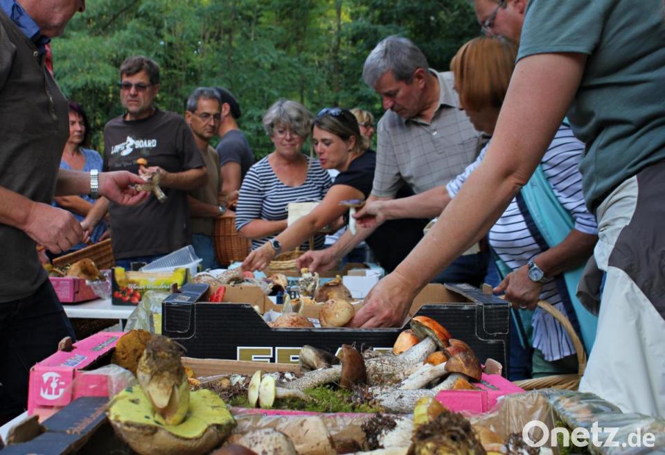 Nach etwa einer Stunde sind wir pünktlich am Waldhaus zurück. Dort erwarten uns Tische, die in U-Form aufgereiht sind. Kartons mit Pilzen als Beispiele sind darauf platziert. Nun sortieren alle ihre gesammelten Exemplare in den Kisten. Es wird eifrig spekuliert, welche der Pilze denn nun essbar wären. Denn darum geht es den meisten: Welche Pilze machen sich gut auf meinem Teller? Wenn es heißt: „den Pilz kann man essen“, dann ist das ein kleines Erfolgserlebnis für die Teilnehmer. Nachdem alle Körbe wieder leer sind erklärt Baumanis in einer Runde um die Tische die wichtigsten Fakten rund um die verschiedenen Pilze.