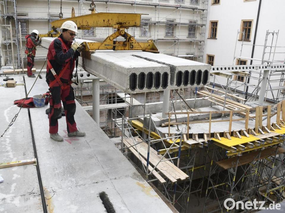 Sobald die Betonfertigteile den Weg an den Ort ihrer Bestimmung gefunden haben, bilden sie das Dach eines barrierefreien Mehrzwecksaales. Er entsteht im Innenhof, ist von drei Seiten von den Außenmauern des Altbaus eingeschlossen und wird eine Glasfassade mit außenliegender Sonnenschutzvorrichtung erhalten. Im Inneren soll künftig das künstlerische Herz des musischen Gymnasiums schlagen, denn neben den 240 Sitzplätzen steht vor allem die halbkreisförmige Bühne im Mittelpunkt. "Er wird zu Beginn des neuen Schuljahres im September 2021 sowohl als Klausursaal und Pausenhalle, als auch als Veranstaltungsort für Chorproben, Konzerte und Theateraufführungen dienen", sagte Josef Pühler vom Staatlichen Bauamt Amberg-Sulzbach.