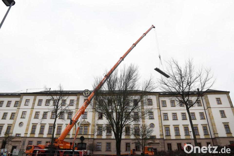Für die Gymnasiasten war schon nach der vierten Stunde schulfrei. Aus Sicherheitsgründen. Für Kranführer, Lkw-Fahrer, Bauarbeiter und Hausmeister ging ab 12 Uhr die Arbeit erst so richtig los. Weiträumig waren die Parkplätze vor der Schule abgesperrt, um Platz zu schaffen für Autokran und Transportfahrzeuge. 20 Betonpfeiler mit einer Länge von 8,60 Meter, einer Breite von 1,20 Meter und einem Gewicht von je 4,4 Tonnen mussten einzeln über die dreistöckige Schule gehievt werden. Die Arbeiter hatten dazu etwa vier Stunden veranschlagt.