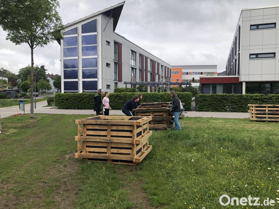 Nach einer Reihe von Stadtrundgängen, beratenden und hilfreichen Gesprächen mit Bärbel Neumüller, Thomas Blank und Bernhard Frank aus der Bauverwaltung sowie Bernhard Richter vom Betriebshof wurden erste Ideen entwickelt und ein Gelände gefunden. Auf der Wiese zwischen der OTH, deren Kindertagesstätte CampusKids und dem Heilig-Geist-Spital stehen seit wenigen Tagen die ersten Hochbeete. Den Prototyp dafür haben die Schüler mit Hilfe von Betriebshof-Mitarbeitern gebaut, danach wurde diese Arbeit unterstützt vom Schulhausmeister im Pausenhof fortgesetzt.