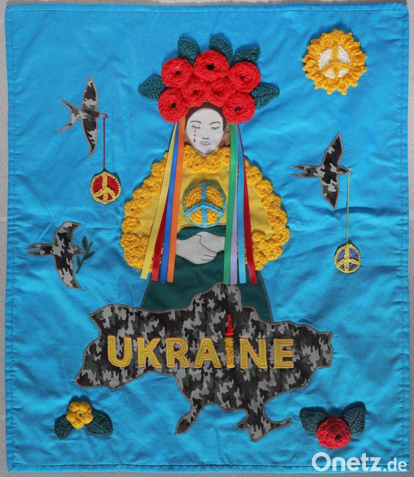 Irina Huber, die bei der Caritas in Amberg arbeitet, und Olha Rudnikova-Gampel, die für den Abend ukrainische Spezialitäten gekocht hatte, stammen aus der Ukraine und leben schon seit vielen Jahren in Deutschland. Olha Yanykh sowie Lesja Filchenko hat die Flucht vor dem Krieg in der Ukraine vor rund einem Jahr nach Amberg geführt. Die vier Frauen haben ihre Gedanken zum Krieg in einem ganz besonderen Wandbehang ausgedrückt: Er zeigt eine ukrainische Frau in Tracht, mit dem typischen Kranz mit Blumen und bunten Bändern auf dem Kopf, umgeben von Friedenstauben und mit der Silhouette der Ukraine in militärischem Tarnfleckmuster. Der Wandbehang ist genäht, aus Stoffteilen zusammengesetzt und mit gehäkelten Motiven bestückt. Irina Huber sagt über das Miteinander der vier Frauen: "Es waren zwei sehr intensive Wochen, die uns zusammengeschweißt und mir persönlich auch weitere Ideen für meine Caritas-Arbeit gegeben haben."