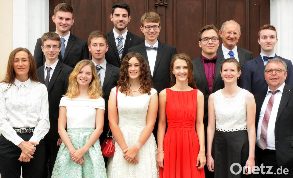 Direktor Wolfgang Wolters (rechts) gratuliert wie die Oberstufenkoordinatoren Angela Ziegler (links) und Albert Kiener (rechts oben) den besten Abiturienten (hinten von links): Tobias Ruder (1,0), Dominik Weber (1,5). Mitte: Fabian Wagner (1,2), Nicolai Fischer (1,3), Alexander Fenk (1,4), Ludwig Stepper (1,0), Jonas Berndt (1,5). Vorne: Franziska Wiesneth (1,5), Julia Wenkmann (1,5), Hanna Überschaer (1,0) und Magdalena Urban (1,0).