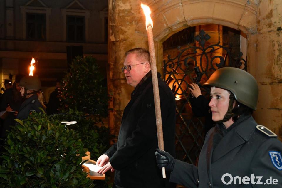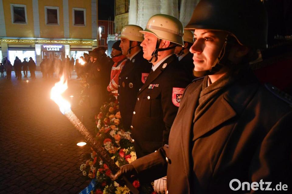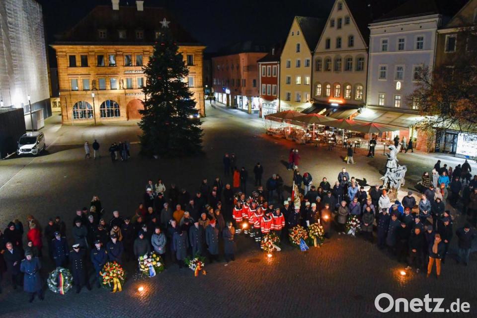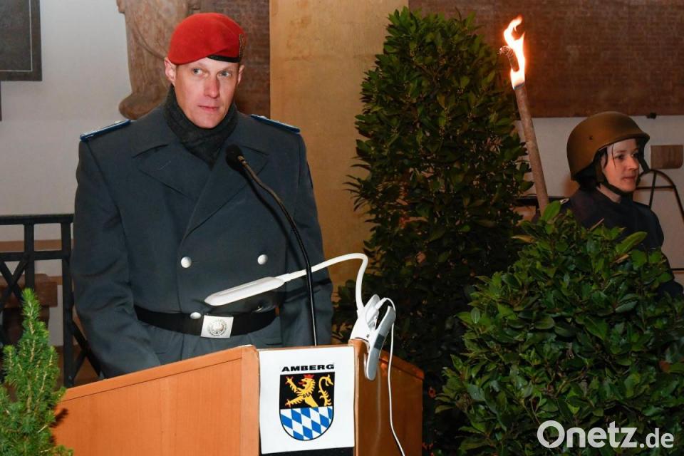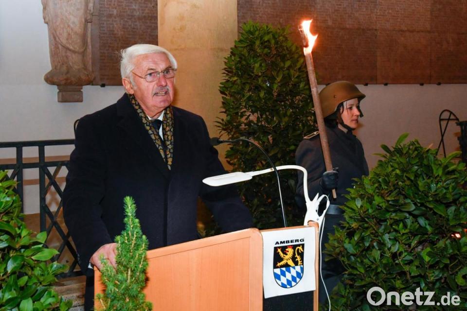 Vor Soldaten und Mitgliedern der Feuerwehr in Uniform und Helm mit Fackeln in der Hand sprach zunächst Oberbürgermeister Michael Cerny zu den rund 200 Menschen auf dem Marktplatz. "Wir sind hier zusammengekommen, um uns bewusst zu machen, wie wichtig der Frieden für unsere Welt ist." Gerade die derzeitigen Ereignisse auf der Welt, insbesondere der Angriffskrieg in der Ukraine und der Terrorakt in Israel, zeigten, dass der Volkstrauertag weiterhin gebraucht werde. "In diesen Wochen spüren wir umso deutlicher, dass ein Leben in Frieden und Freiheit eben nicht selbstverständlich ist." Alleine in Amberg haben mehr als 700 Kriegsflüchtlinge Schutz gesucht. "Natürlich gibt es auch bei uns Ukrainerinnen und Ukrainer, die zum einen in unserer Mitte Schutz gefunden haben, zum anderen aber auch die Nachricht vom Tod eines geliebten Menschen erhalten haben. Ihre Trauer und ihr Leid zeigt, in wie vielen hunderttausenden Einzelschicksalen der Krieg die Träume junger Menschen, die Pläne von Familien und die Liebe zwischen zwei Menschen zerstört." Gleichzeitig aber gebe es auch Menschen in Russland, die um ihre an der Front gefallenen Männer und Söhne weinen.