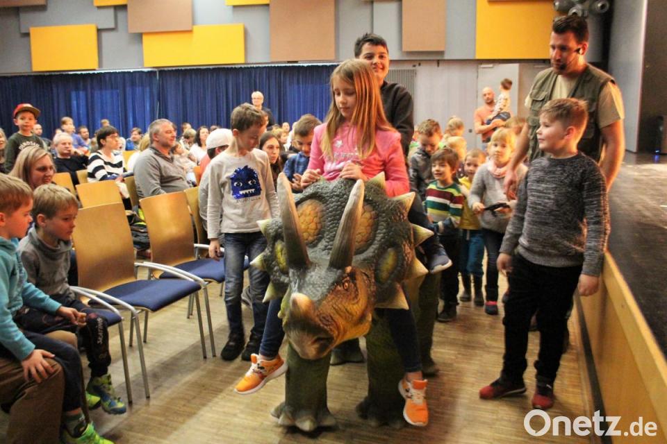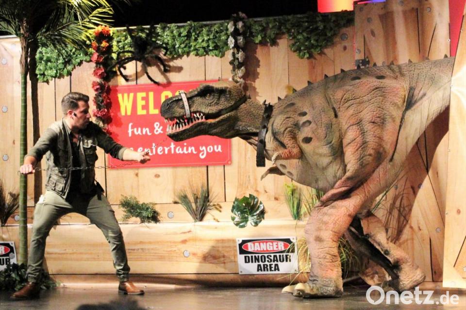 Ob Dinos auch Donuts essen? Der Velicaraptor spuckt die Süßspeise aus. Klar, er ist Fleischfresser. Das weiß aber auch wirklich jedes Kind. Drei große Steaks gibt es zum Verfüttern. Aus Gummi versteht sich, denn diese vorgeführten Dinos sind nur lebensecht und nicht lebendig. Aber verdammt nah dran. Sie kommen aus Amerika und stammen von den Machern, die auch schon den Film Jurassic Park mit ihren Urzeit-Reptilien ausgestattet haben. Knapp 5000 Dollar kostet laut Carmo Neigert so eine technische Nachbildung, auf der auch geritten werden kann.