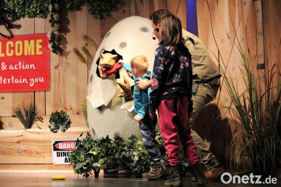 Es beginnt ganz ruhig mit einem etwa 20 Zentimeter großem Ei. Moderator Carmo Neigert fragt das junge und ältere Publikum, was darin wohl stecken könnte. Ein Langhals-Baby kommt zum Vorschein - und es darf auch gestreichelt werden. Während sich der Ansbacher durch die Reihen schlängelt, erklärt er, wie es vor 65 Millionen Jahren auf der Erde ausgesehen haben könnte.