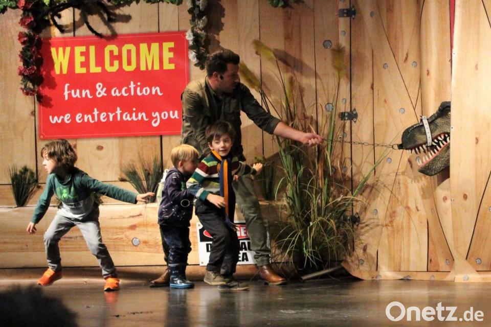 Ein ganz mutiges Mädchen wirft einem fast zwei Meter hohem Flugsaurier Fische zum Fraß vor. Drei andere kleine Helden ziehen an einer Eisenkette und helfen Neigert, einen T-Rex zum Vorschein zu bringen. Kaum ist der beängstigende Kopf zu sehen, rennen die kleinen Füße aber ganz schnell weg. Denn diese Tiere schnappen auch mal zu, da erschrecken sogar die Eltern. Wie beim Tierforscher Steve Irwin werden Köpfe in die Mäuler gesteckt. Ganze Arme verschwinden in den Ungetümen.