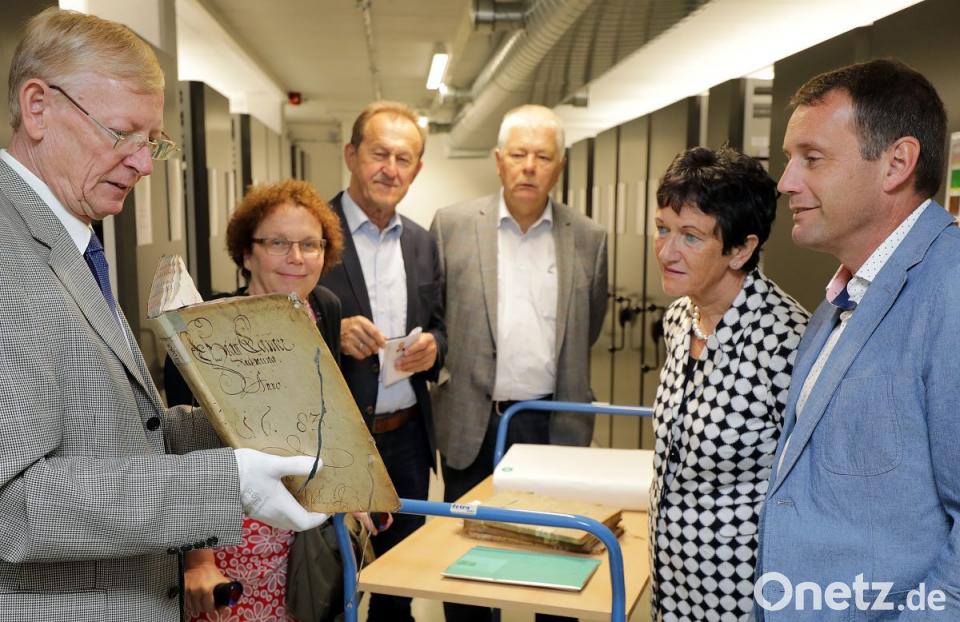 Ambergs Archivar Johannes Laschinger führte die Besucher durch das Gebäude im Gebäude. Der historische Stodl bildet nämlich die äußere Hülle, während im Inneren ein würfelartiges Betongebäude ist. Ein Neubau im Altbau sozusagen. Im Magazin zeigte er ein Amberger Rechnungsbuch aus dem Jahr 1683. Dort sind alle Einnahmen und Ausgaben der Stadt verzeichnet. Mit Interesse bestaunten die Politiker das historische Pergament.