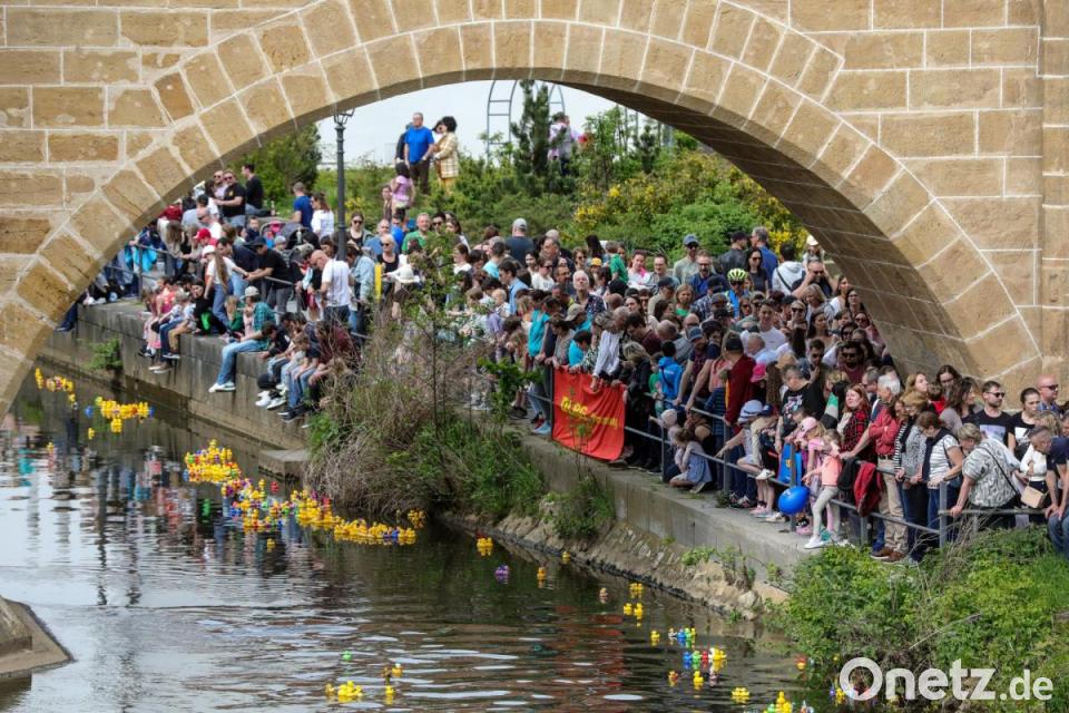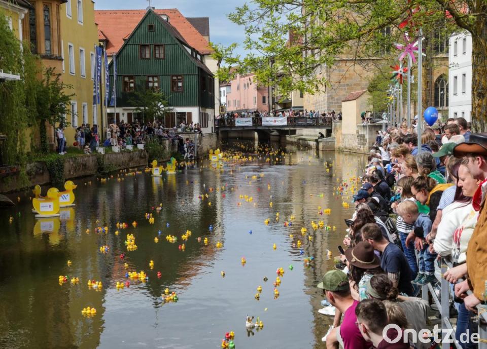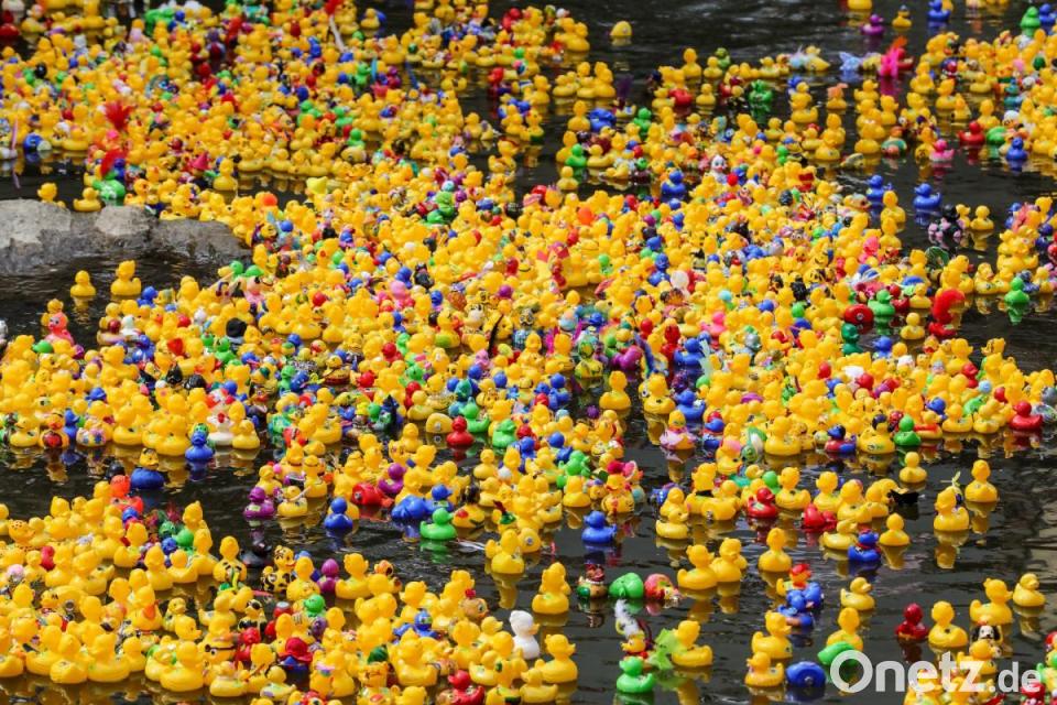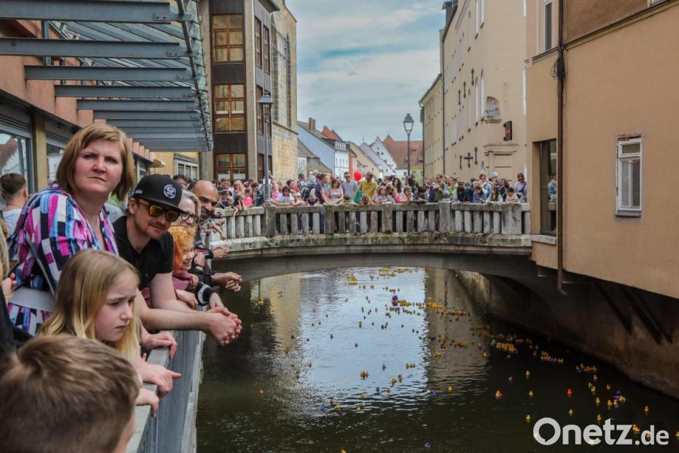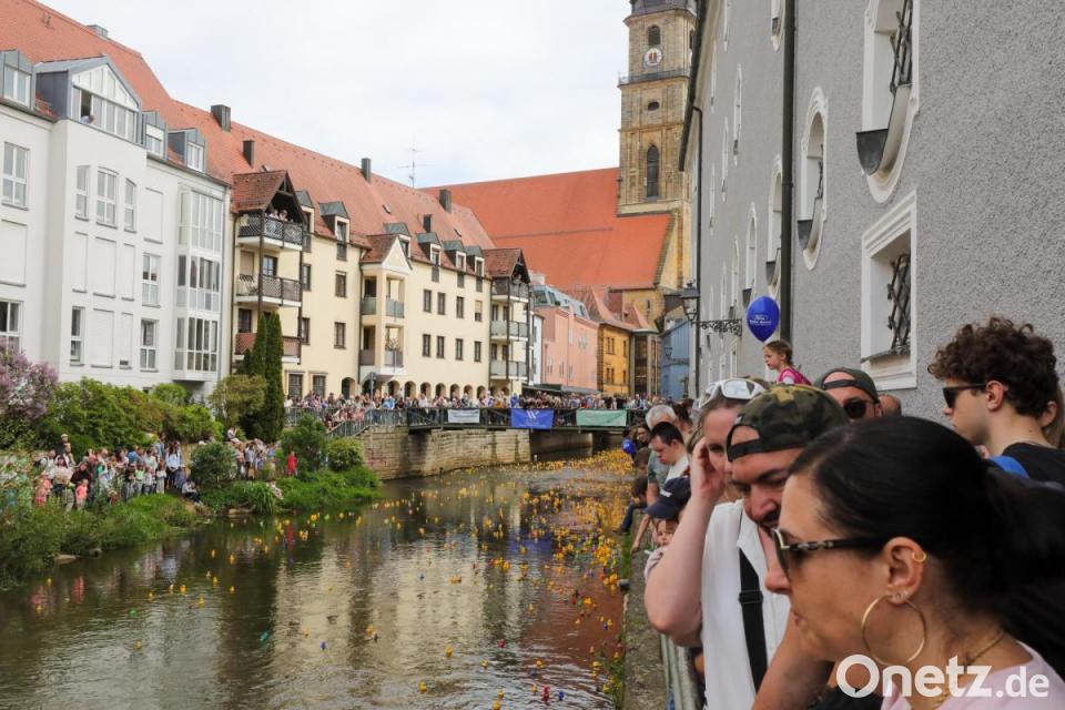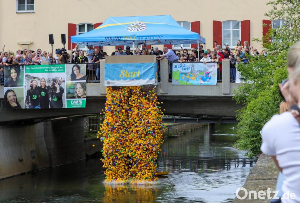 Am Ende war es ein Kopf-an-Kopf-Rennen. Bikini-Ente lag lange vorne, doch kurz vor der Zielgeraden huschte eine andere an ihr vorbei und machte den ersten Platz beim Amberger Entenrennen. Ein Sensationssieg. Obwohl Ente 8185 offenbar gerade erst Schwimmen gelernt hat - sie war mit Schwimmbrille und Seepferdchen auf der Brust unterwegs - hat sie ihren rund 9000 Kontrahentinnen bewiesen, wer in Amberg den Schnabel vorne hat. Seepferdchen-Ente war auch ziemlich flott unterwegs. Um 15.30 Uhr hatte Round-Table-Präsident Andreas Heil den Startschuss an der Fronfestgasse gegeben. Um 15.53 schwamm das quietschgelbe Erstschwimmerentchen ins Ziel am Kurfürstlichen Schloss beim Landratsamt.