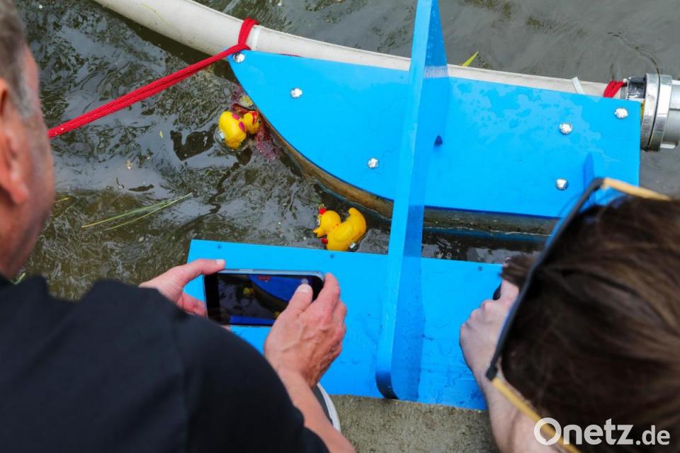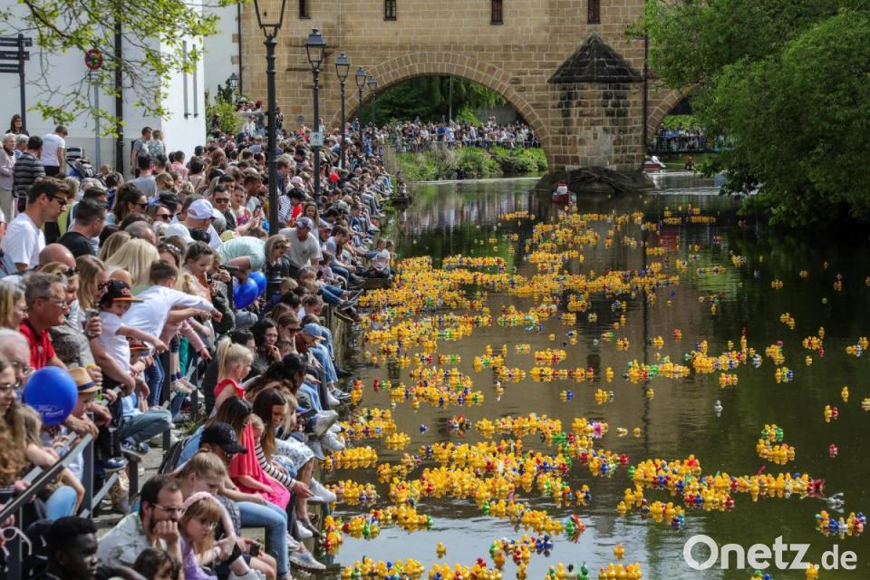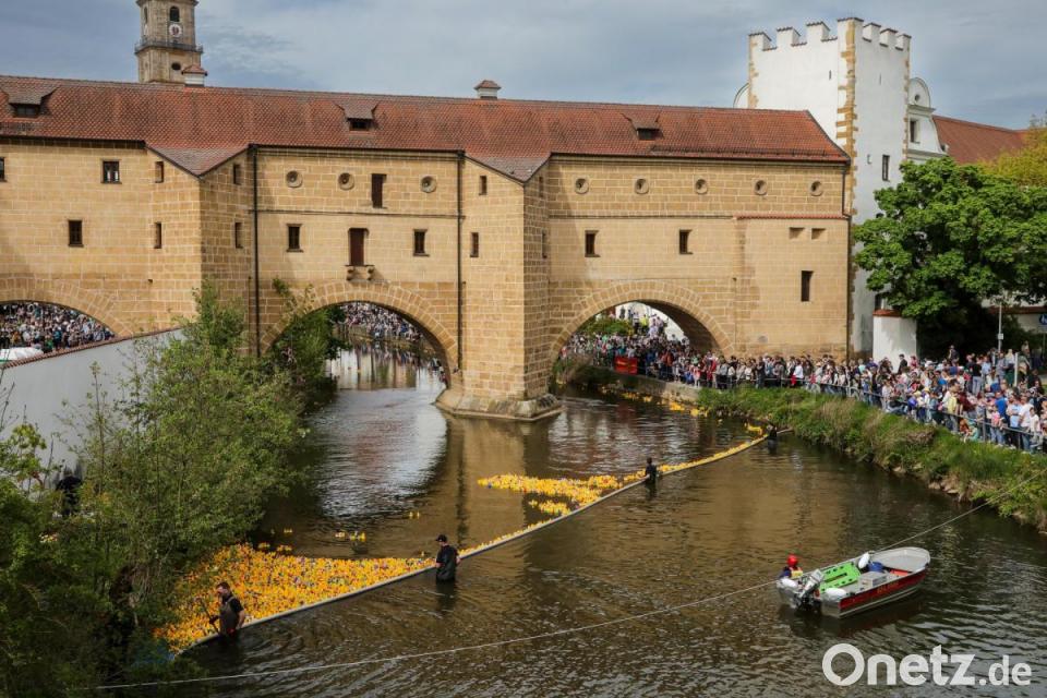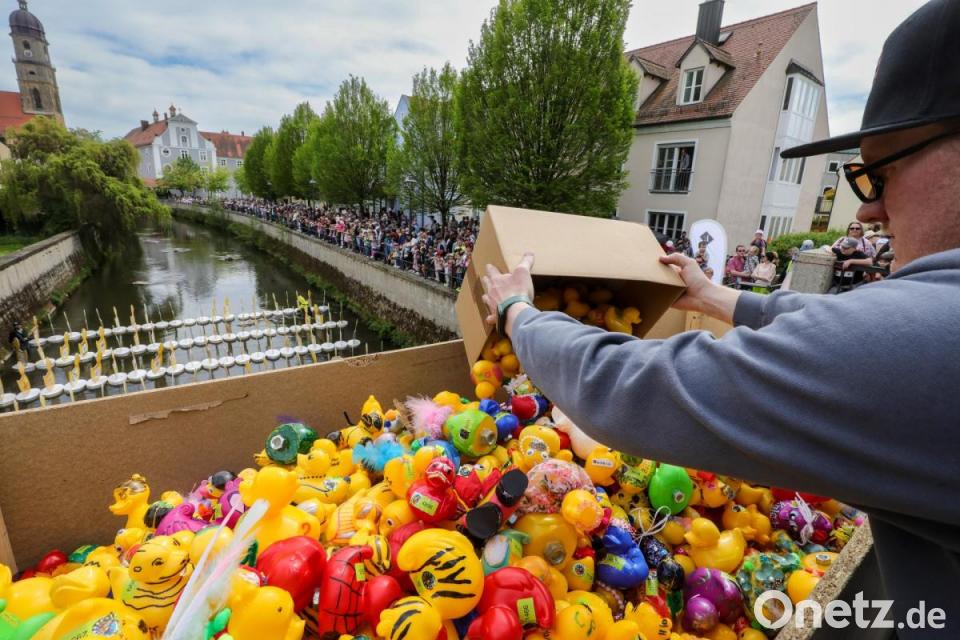 "Schon wieder ein neuer Rekord", sagte der Round-Table-Chef im Gespräch mit Oberpfalz-Medien kurz vor Rennstart. Vergangenes Jahr waren bereits 7500 Enten an den Start gegangen und hatten eine neue Marke gesetzt. Die haben die 9000 Badeenten heuer pulverisiert. Heil zeigte auf die Gitterbox mit Holzaufbau an der Brücke vor der Fronfeste, die beinahe bis zum Platzen mit den gelben Gummivögeln gefüllt war. "Wir haben unsere Startbox extra vergrößert und sie reicht schon wieder nicht mehr aus."