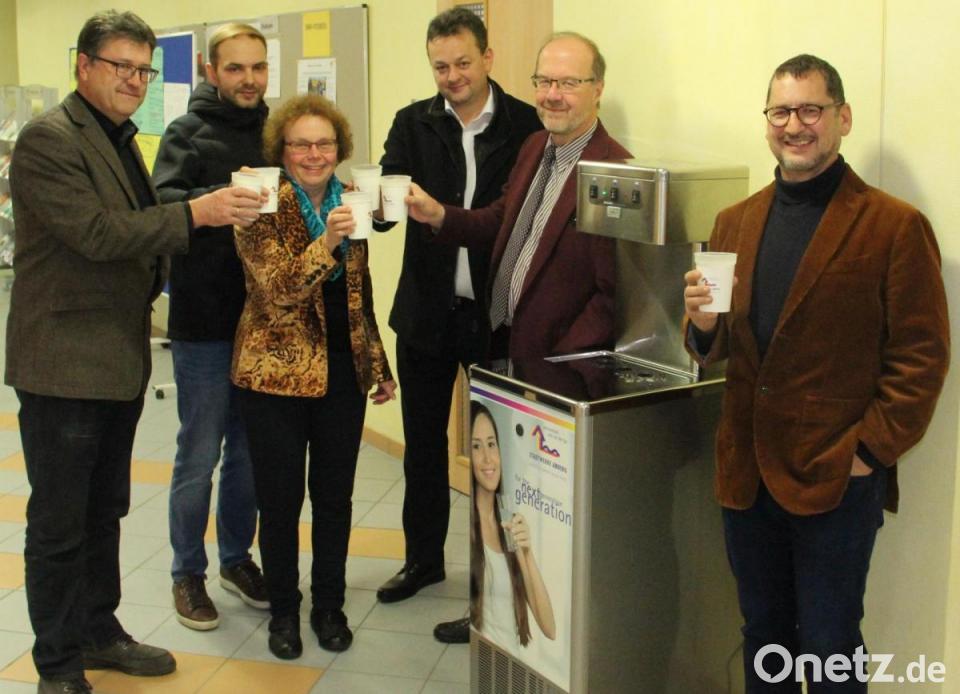 Auch mit Wasser lässt sich gut anstoßen: Darüber sind sich (von links) Josef Eckert (stellvertretender Schulleiter), Maximilian Deget (Stadtwerke), Bürgermeisterin Brigitte Netta, Elternbeiratsvorsitzender Roland List, Schulleiter Martin Wurdack und Markus Rebmann von der Firma Gleisner aus Lauf einig.