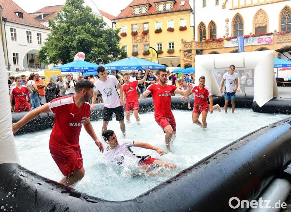 Für viele Water-Splash-Besucher war das Water-Soccer vor einem Jahr die Attraktion auf dem Amberger Marktplatz schlechthin. Colomba-Inhaber Daniel Hoffmann hoffte auf eine spaßige Wiederholung am Samstag und Sonntag, 13. und 14. Juli. Das Wetter machte den Veranstaltern und den angemeldeten Kneipen-Teams einen Strich durch die Rechnung. Witterungsbedingt wurde die Veranstaltung am Freitagnachmittag abgesagt.