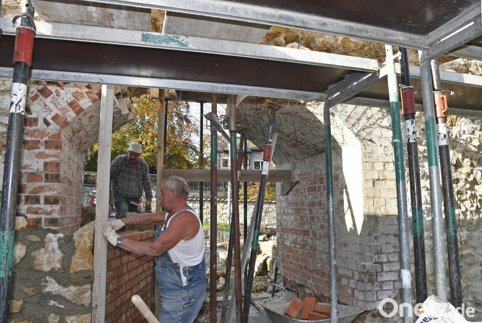 Gleichzeitig zur Mauersanierung verändern die Arbeiter derzeit den Durchlass selbst. Der bisherige Rundbogen ist vor allem für die Köpfe von Radfahrern eine permanente Gefahr und muss entsprechend abgeändert werden. Zusätzlich liegt der neue Pioniersteg etwas anders über den Stadtgraben, als dies der Vorgänger tat. Was einfach mit dem Gefälle zusammenhängt, wie Füger sagt. Das erfordert auch vom Durchlass in der Mauer einen etwas anderen Schnitt.