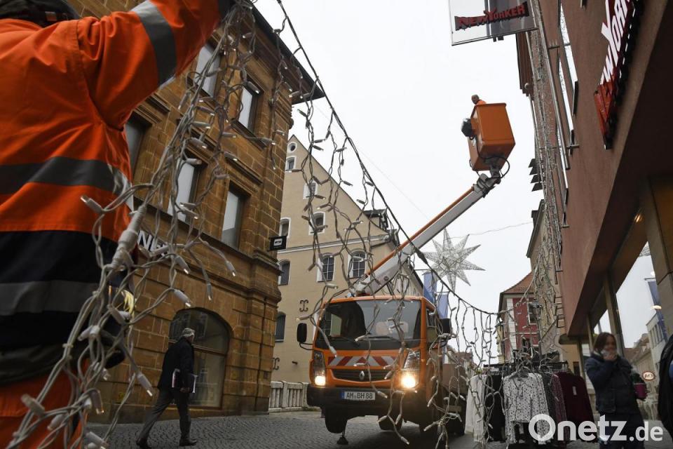 Bereits am Montag wurde der große Stern über der Krambrücke in die Höhe gehievt. Jetzt folgen nach und nach die Lichter-Girlanden in der Fußgängerzone zwischen Malteserplatz und Bahnhofstraße. Mindestens bis Lichtmess 2021 soll die Beleuchtung die Altstadt abends und nachts in ein angenehm warmes Licht rücken.